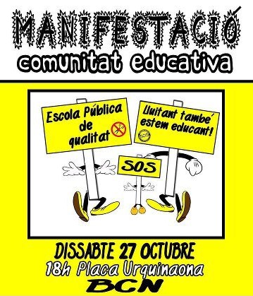 – Participar a la propera manifestació convocada pel MUCE (Marc Unitari de la Comunitat Educativa ) el dissabte 27 d´octubre. Començarà a les 18 hores a la Plaça Urquinaona. Us convoquem a les 17,15 h a la porta de l´escola per anar-hi plegats.