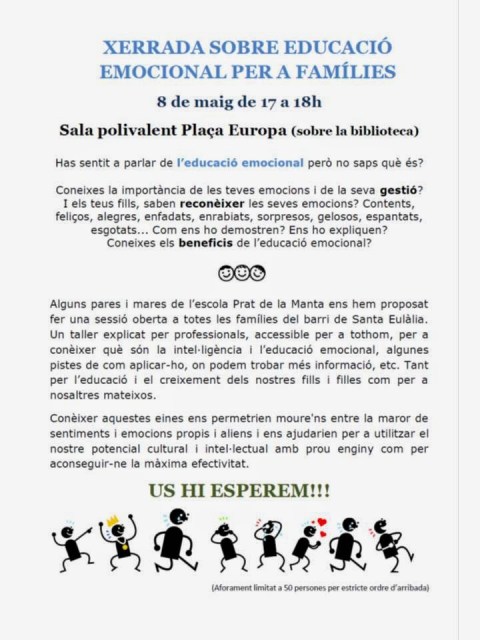 Per iniciativa d’un grup de pares i mares del Prat de la Manta, hem engegat un projecte de formació en Intel.ligència Emocional per famílies. Estem gaudint molt i ho volem compartir amb la resta de les escoles del barri. És per això que volem convidar a tothom que estigui interessat a la sessió informativa que tindrà lloc el proper 8 de maig a les 17h a la sala polivalent de la Plaça Europa (sobre la biblioteca).