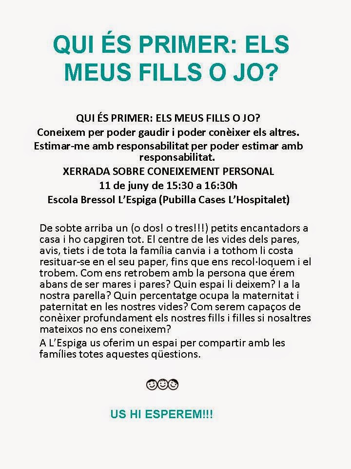 Us informem que la propera setmana hi ha organitzada una xerrada sobre creixement personal, en la línea de l’educació emocional: conèixer-nos millor per poder conèixer els altres. Estimar-nos amb responsabilitat per poder estimar als altres.