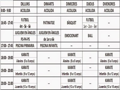 Us informem de les activitats extraescolars que s’impartiran durant aquest curs que ara comença. Com a novetat d’aquest nou curs ens plau destacar KARATE,JUGUEM EN ANGLÉS i EMOCIONART que augmenta la varietat oferta fins ara. Desitgem siguin del vostre interès i us convidem a les diferents sessions informatives que s’han programat.