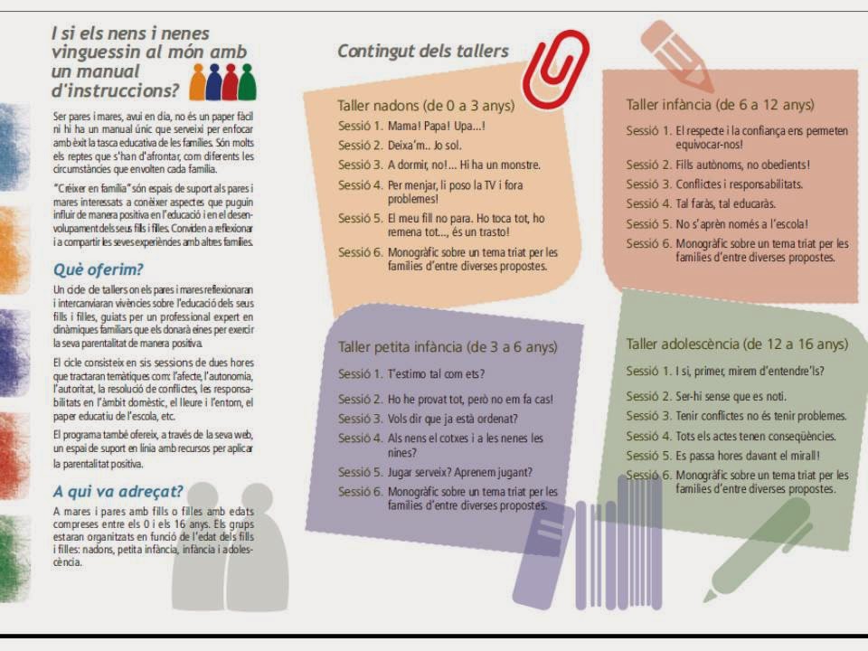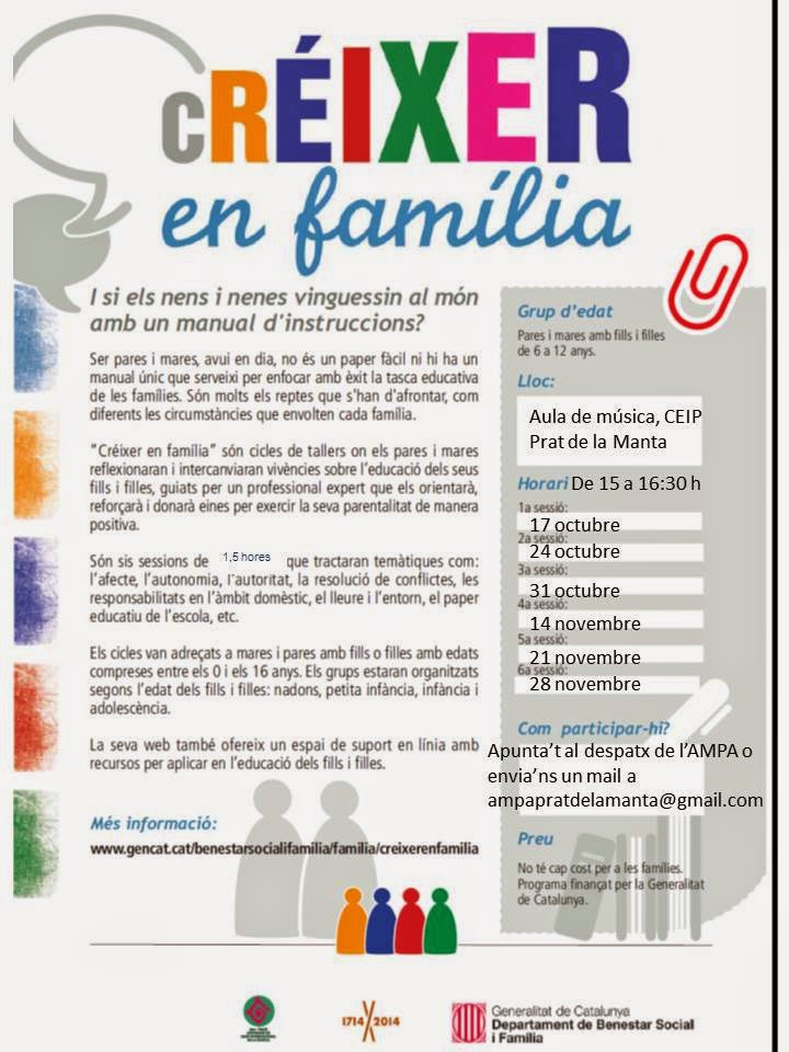 durant aquest primer trimestre del curs es realitzarà el curs “Créixer en família”, organitzat per la Generalitat i adreçat a famílies de nens entre 6 i 12 anys.
