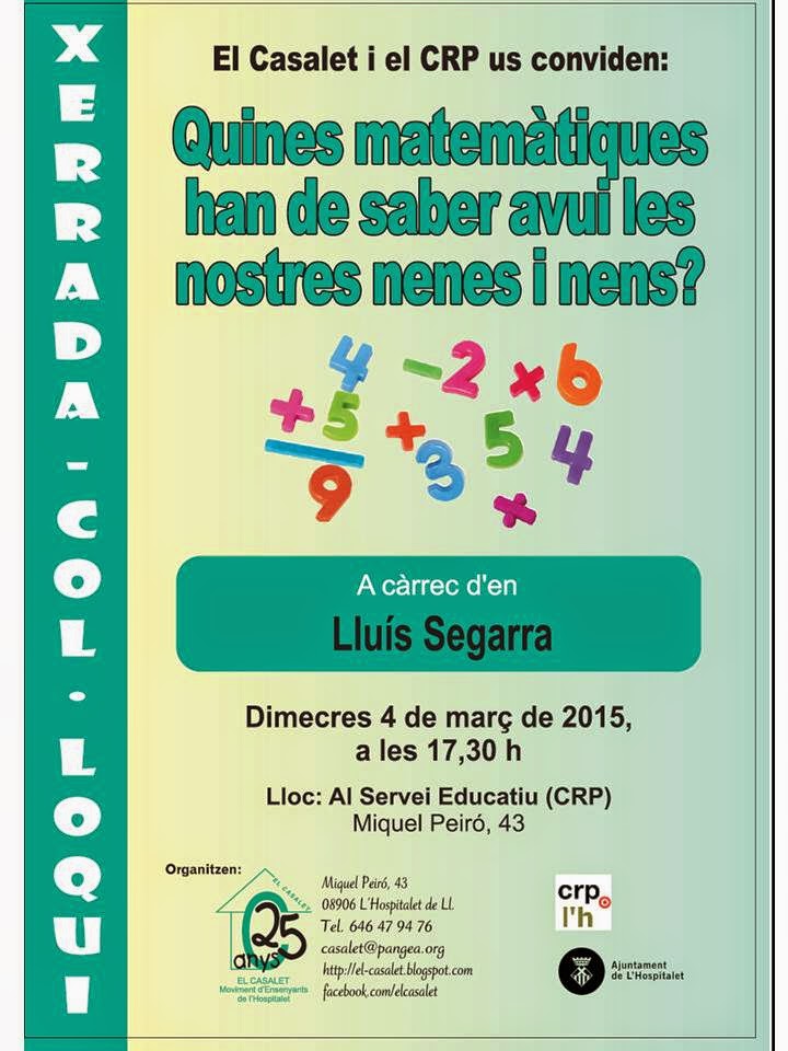 El proper 4 de març a les 17.30 h El Casalet i el CRP us conviden a la xerrada “Quines matemàtiques han de saber avui les nostres nenes i nens ? ” a càrrec d’en LLuís Segarra que es farà al servei educatiu ( CRP) carrer Miquel Peiró, 43 de la nostra ciutat.