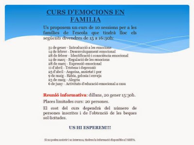 Com veureu, tenim previst començar de nou amb les xerrades d’aquí a molt poquet. Es tractaran diversos temes sobre l’ educació dels fills i filles des de casa, quines postures prenem les mares i pares i com els podem ajudar a créixer. Si esteu interessats, estigueu al tant de la informació que anirem difonent i no dubteu en posar-vos en contacte amb nosaltres per qualsevol dubte o comentari!!