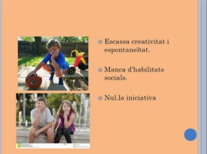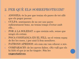 La Lídia també ens va explicar les causes d’ aquesta Sobreprotecció, com l’ angoixa, la culpa, por a la soledat, manca de confiança en el fill… i les seves conseqüències com la dependència, escassa tolerància a la frustració, baixa autoestima, nul.la iniciativa, nens tirans i xantatgistes.
