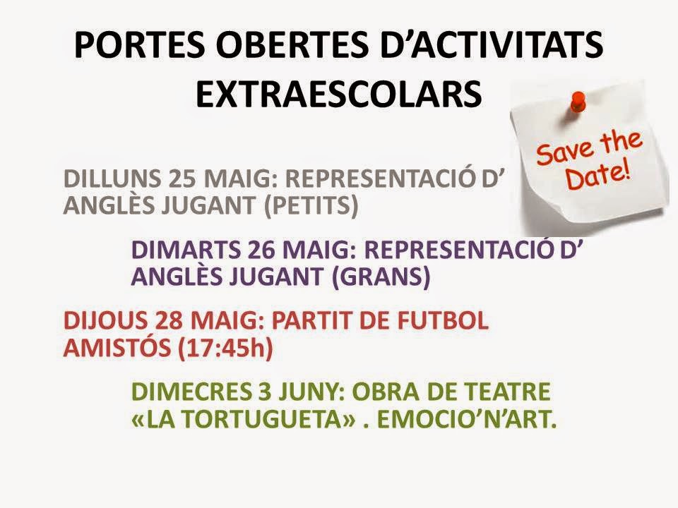 PROPERA SETMANA: PORTES OBERTES D’EXTRAESCOLARS 21/05/2015 per AFA Prat de la Manta, posted in Extraescolars, Sin categoría Benvolgudes famílies, Us recordem les dates de les properes portes obertes d’ extraescolars. No deixeu de participar!! Descobriu-ne més des de Subscribe to get the latest posts sent to your email. Escriviu el vostre correu electrònic… Subscriu-me Comparteix això: Share on WhatsApp (S'obre en una nova finestra) WhatsApp Comparteix al Facebook (S'obre en una nova finestra) Facebook Share on X (S'obre en una nova finestra) X Email a link to a friend (S'obre en una nova finestra) Correu electrònic Imprimeix (S'obre en una nova finestra) Imprimeix M'agrada S'està carregant... Relacionado