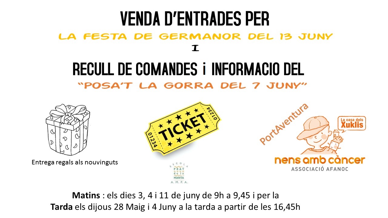 durant les 2 primeres setmanes del mes de juny trobareu el despatx obert en horari especial per facilitar la compra d’entrades per la festa de germanor, recollir el regal dels nouvinguts d’aquest curs i fer l’encàrrec de la gorra (festa “posa’t la gorra”).