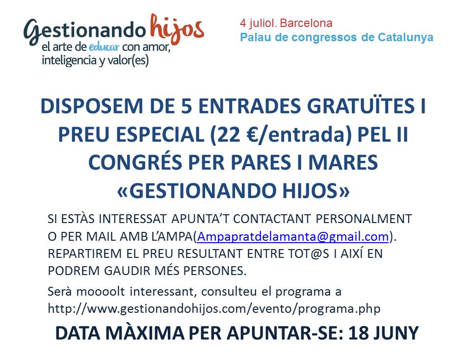 PREU ESPECIAL PEL CONGRÉS PER PARES I MARES “GESTIONANDO HIJOS” 16/06/2015 per AFA Prat de la Manta, posted in Educació Emocional, Sin categoría Accediu directament al programa a: http://www.gestionandohijos.com/evento/programa.php Descobriu-ne més des de Subscribe to get the latest posts sent to your email. Escriviu el vostre correu electrònic… Subscriu-me Comparteix això: Share on WhatsApp (S'obre en una nova finestra) WhatsApp Comparteix al Facebook (S'obre en una nova finestra) Facebook Share on X (S'obre en una nova finestra) X Email a link to a friend (S'obre en una nova finestra) Correu electrònic Imprimeix (S'obre en una nova finestra) Imprimeix M'agrada S'està carregant... Relacionado