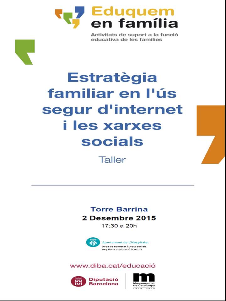 El proper dimecres 2 de desembre es celebrarà un taller sobre l’ús més segur d´internet i les xarxes socials a casa. Serà impartit per la Regidoria d´Educació, en col.laboració amb la Diputació de Barcelona, tindrà lloc a l’edifici de la Torre Barrina (Parc de la Marquesa, Collblanc) i és gratuït.