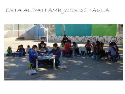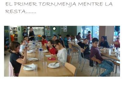 En quant als nens i nenes que fan servir aquest servei, aquest curs es queden uns 90-95 alumnes a menjador. Hi ha quatre grups diferenciats: les girafes (p3), balenes i estrelles (p4 i p5), els cargols (1er i 2on) i les formigues (3er, 4rt, 5è i 6è). Les seves monitores són respectivament la Laia, la Marta, la Sara i la Gemma. Aquest any hi han dos monitors de reforç: la Sílvia i el Nico. El grup de formigues fan dos torns per menjar i mentre uns estan al menjador dinant la resta està al pati fent alguna activitat asseguts (jocs de taula, dibuixar,…).