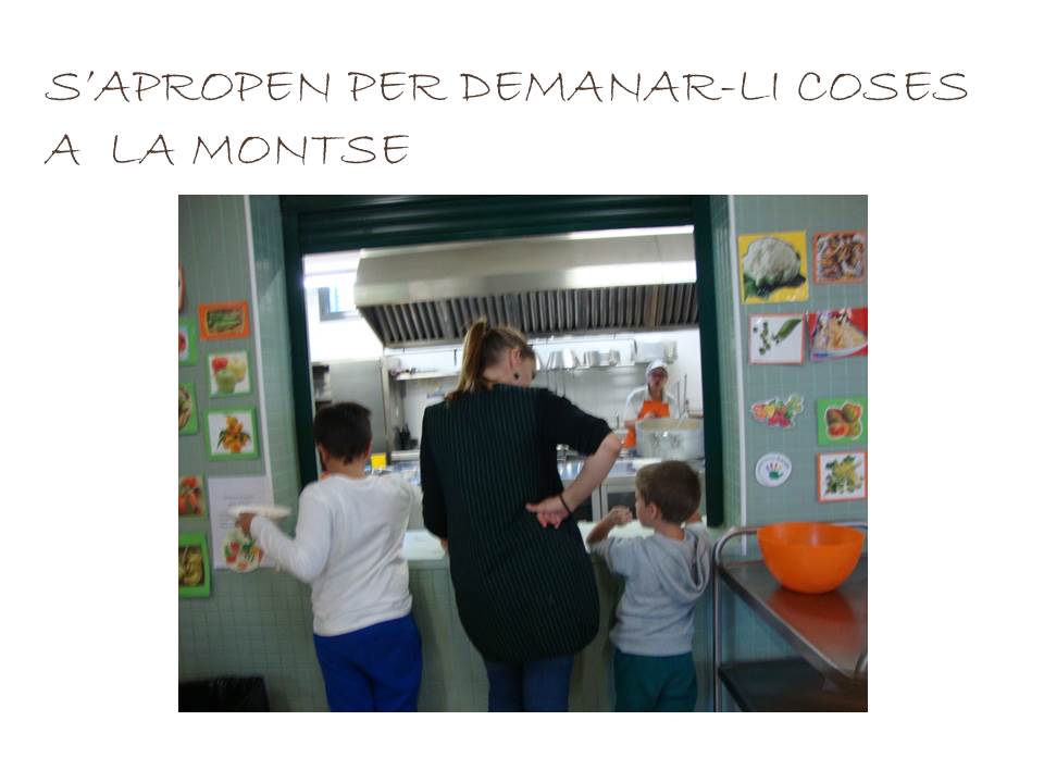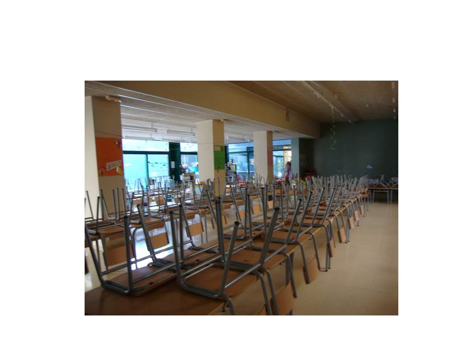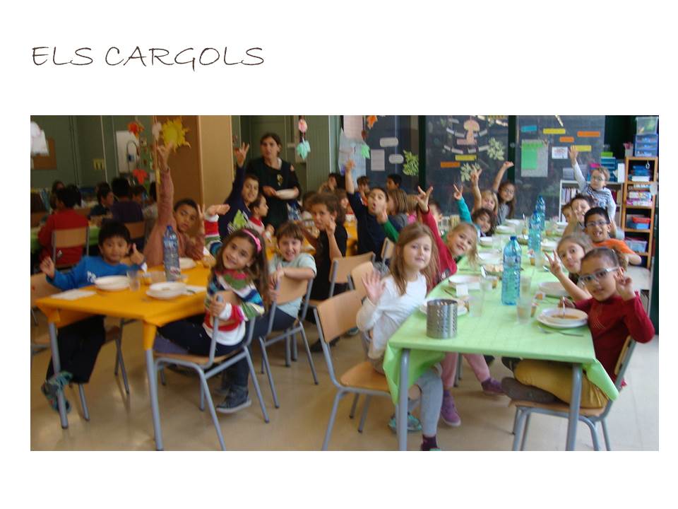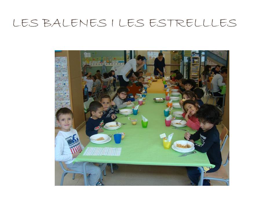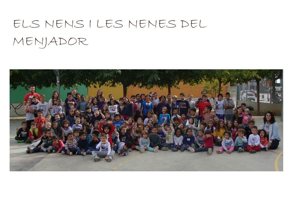 En quant als nens i nenes que fan servir aquest servei, aquest curs es queden uns 90-95 alumnes a menjador. Hi ha quatre grups diferenciats: les girafes (p3), balenes i estrelles (p4 i p5), els cargols (1er i 2on) i les formigues (3er, 4rt, 5è i 6è). Les seves monitores són respectivament la Laia, la Marta, la Sara i la Gemma. Aquest any hi han dos monitors de reforç: la Sílvia i el Nico. El grup de formigues fan dos torns per menjar i mentre uns estan al menjador dinant la resta està al pati fent alguna activitat asseguts (jocs de taula, dibuixar,…).