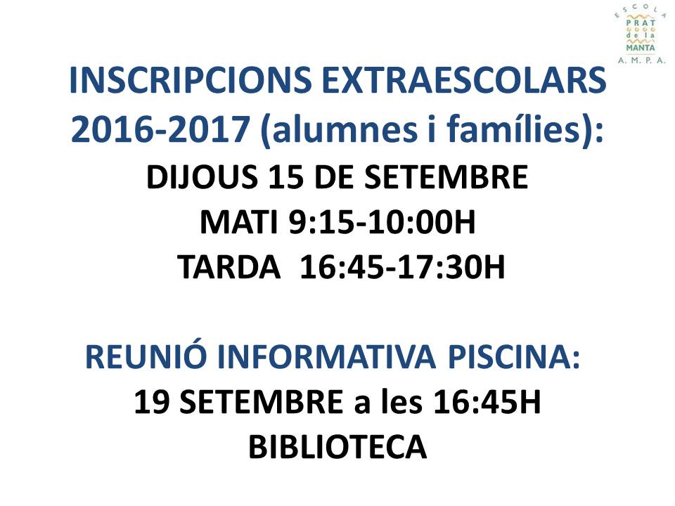 INSCRIPCIÓ EXTRAESCOLARS 2016-2017 13/09/2016 per AFA Prat de la Manta, posted in Extraescolars, Sin categoría Trobareu la informació de les extraescolars proposades per aquest nou curs a la pàgina “Extraescolars”. També podeu imprimir el full d’inscripció i portar-ho ja omplert. Descobriu-ne més des de Subscribe to get the latest posts sent to your email. Escriviu el vostre correu electrònic… Subscriu-me Comparteix això: Share on WhatsApp (S'obre en una nova finestra) WhatsApp Comparteix al Facebook (S'obre en una nova finestra) Facebook Share on X (S'obre en una nova finestra) X Email a link to a friend (S'obre en una nova finestra) Correu electrònic Imprimeix (S'obre en una nova finestra) Imprimeix M'agrada S'està carregant... Relacionado