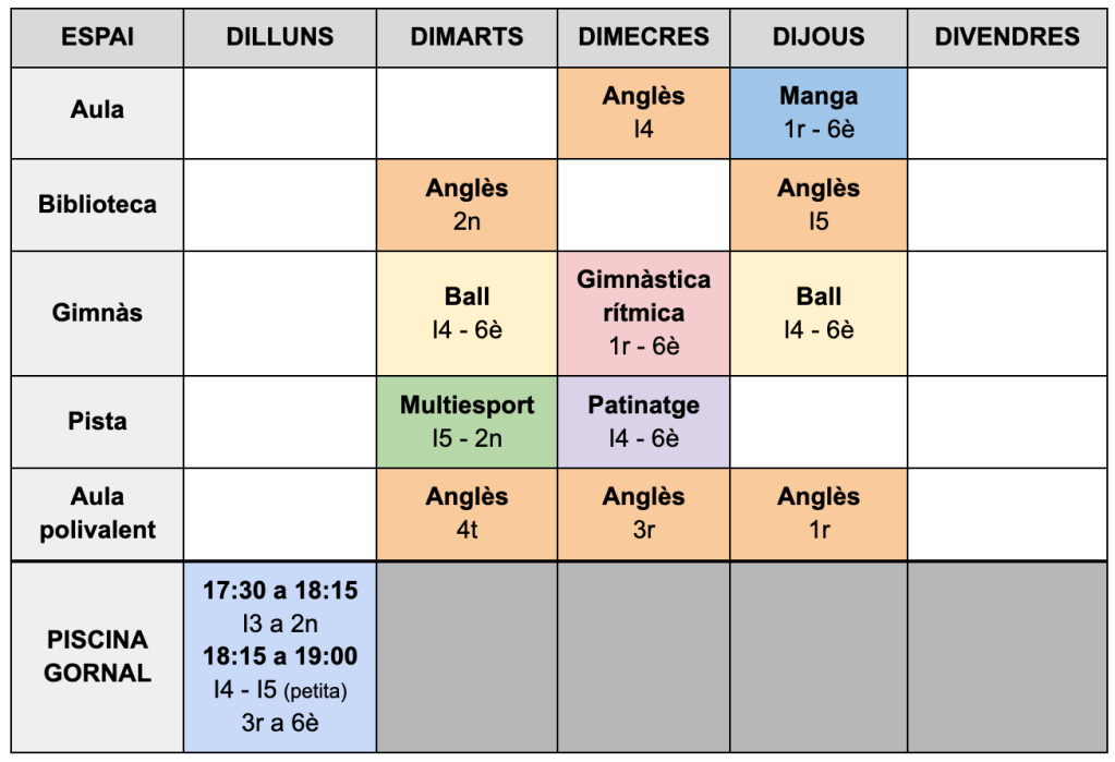 Totes les activitats, excepte piscina i les classes d’anglès de 4t a 6è, es realitzen a l’escola.